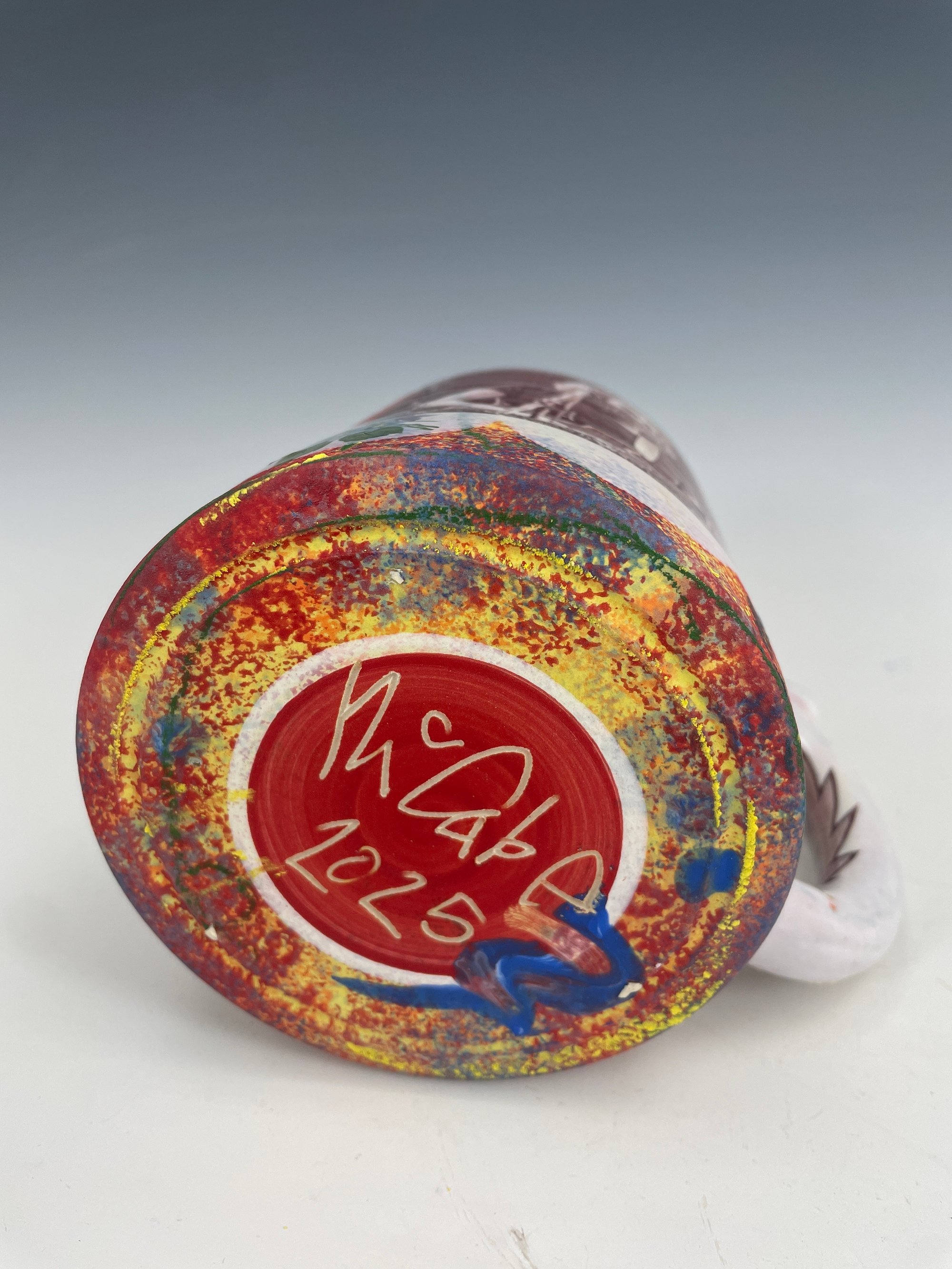 Handmade porcelain mug, hand tye dyed, glazed, decaled.
